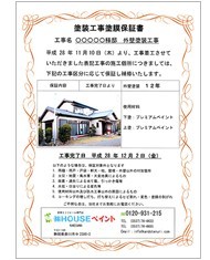 施主様との信頼を守るため、工事の大小に関わらず「塗装工事施工保証書」を発行し皆様にお渡ししています。