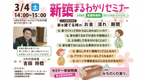 3/4(土)14:00~15:00に、とわだ店にて『新築まるわかりセミナー』を開催します!