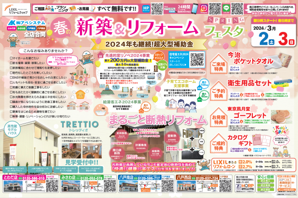 3月2日(土)・3日(日)の2日間、LIXILリフォームショップ全4店舗で『春の新築&リフォームフェスタ』を開催します!